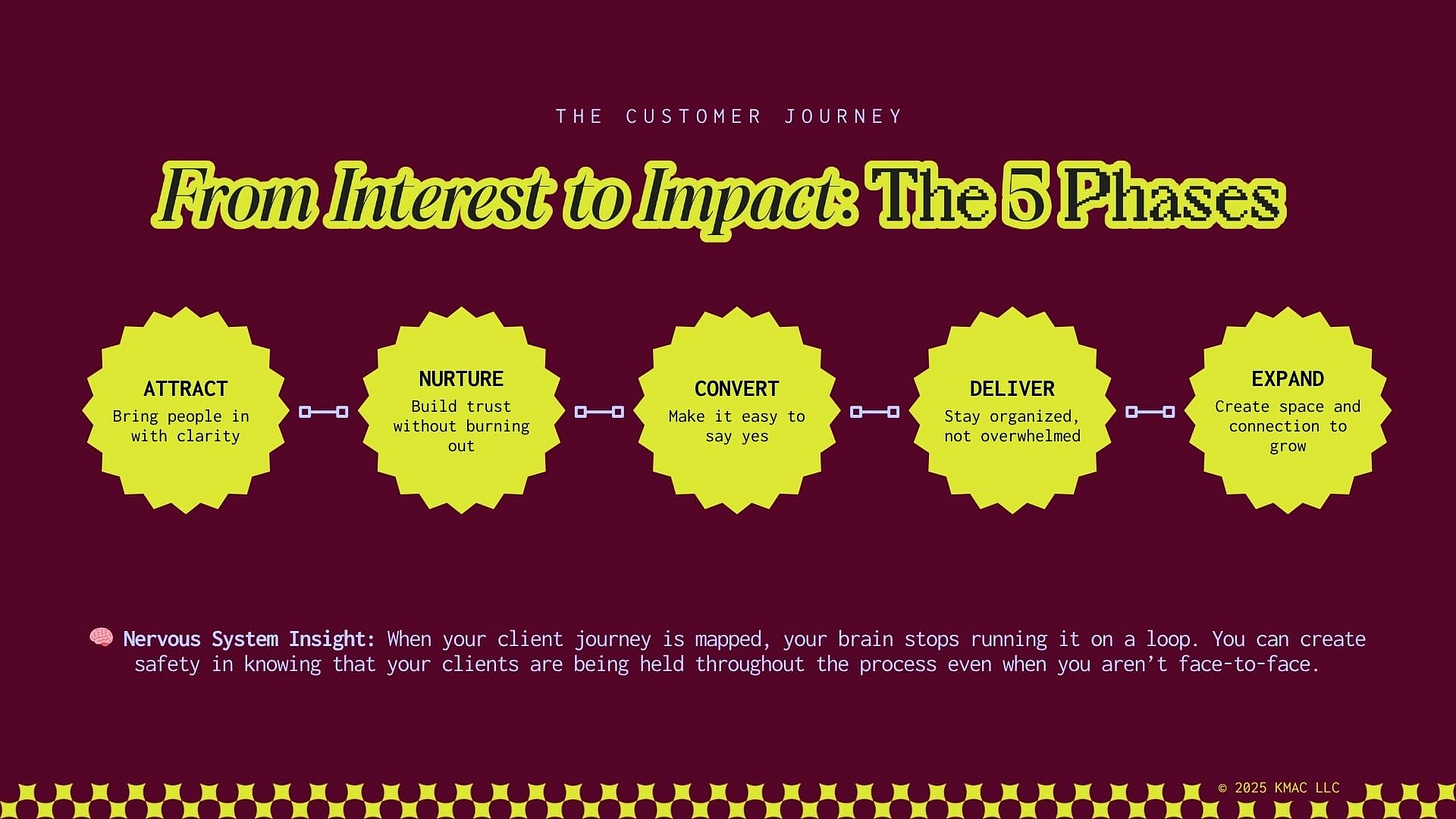 This came up during my Petite Retreat: Systems Setup in such a real, embodied way. Both clients happened to be a Manifestor and a Projector—the two Human Design types most likely to override their body’s cues in pursuit of momentum or proving. We zoomed all the way out and mapped their entire customer journey through the lens of capacity and nervous system support, looking at what stage of the journey requires what type of energy, and how to plan around their actual nervous system bandwidth, not just the metrics.