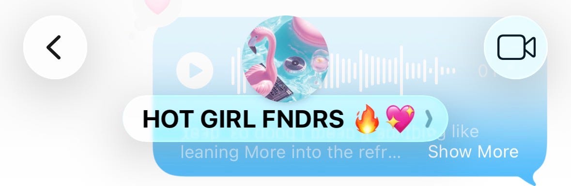 The names of the chats alone telling on the energy: HOT GIRL FNDRS 🔥💖. Super Yacht WhatsApp.