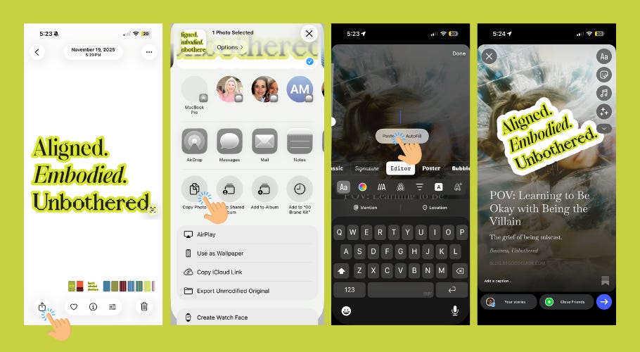 This is a screenshot of your brand colors (bonus points for hex codes and all). When you’re creating a story or a reel inside Instagram, you’ll use this to eyedrop your exact brand colors for backgrounds, text, and overlays. No guessing. No “that’s close enough.” Your actual colors, every time.