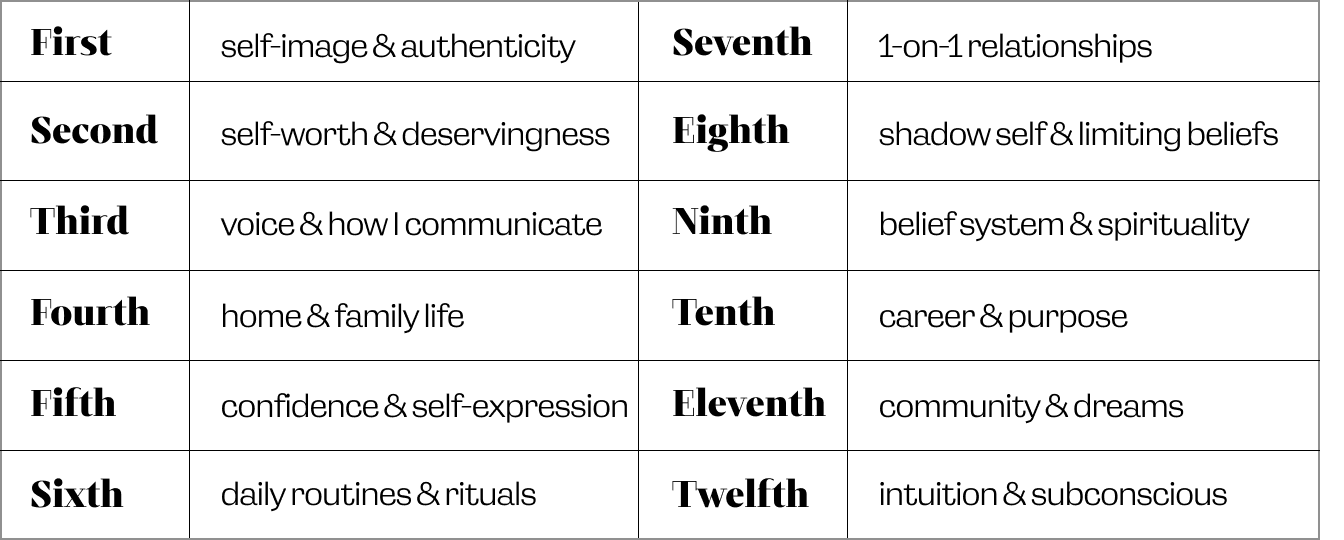 And also a lot to process. Let's break it down for you MadLibs style (sorry, my millennial is showing). Use the rubric below to fill in your year in reflection based on the major transits above. Look at your birth chart and find the sign mentioned in the sentence. Locate what house that sign is in and replace the placeholder text with the meaning from the cheat sheet below.