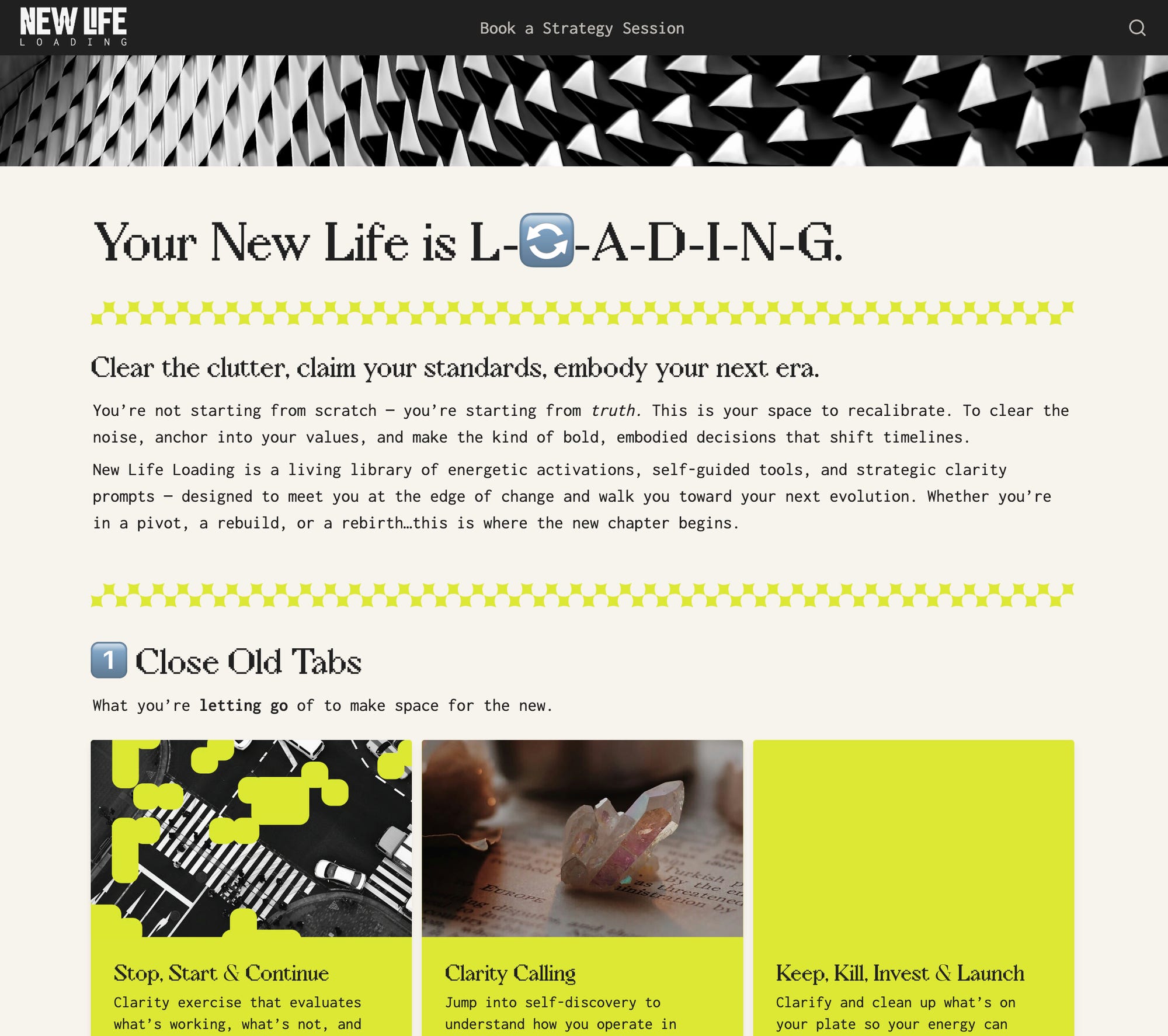 That’s exactly why I created 🌀 New Life Loading — an activation portal for soul-led entrepreneurs and creatives who are ready to rebuild from the inside out. Think of it as a library-meets-toolkit for aligned strategy, rituals, and systems that honor your energy.